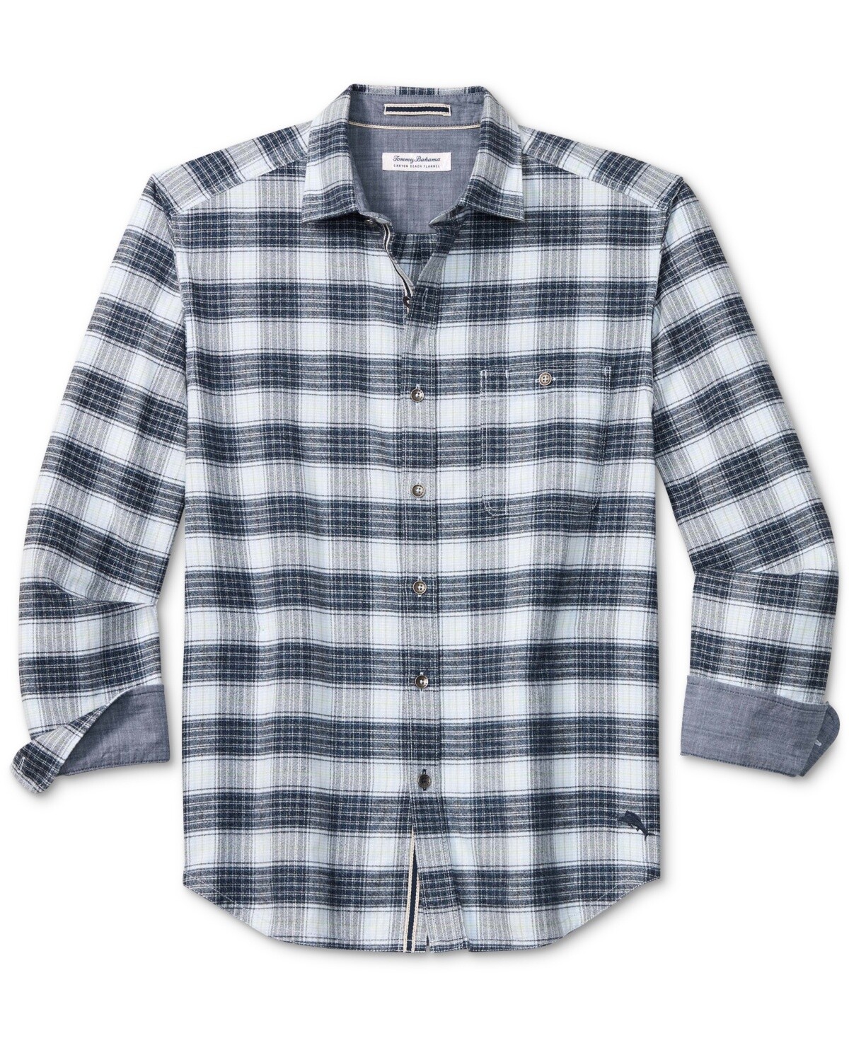 Step into the casual comfort of this long-sleeve shirt from Tommy Bahama, designed with a button-through patch pocket and shirttail hem.
